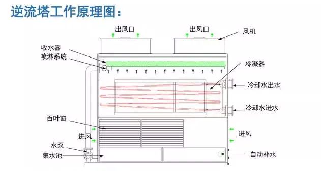 我們都知道冷卻塔有三種冷卻形式,卻不知道這三個都是什么樣子怎么區分。不管是開式冷卻塔還是閉式冷卻塔,一般都分為橫流和逆流兩種,所謂橫流,即冷卻塔的進風方向與水流的方向成直角,這種冷卻塔適用于民用中央空