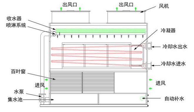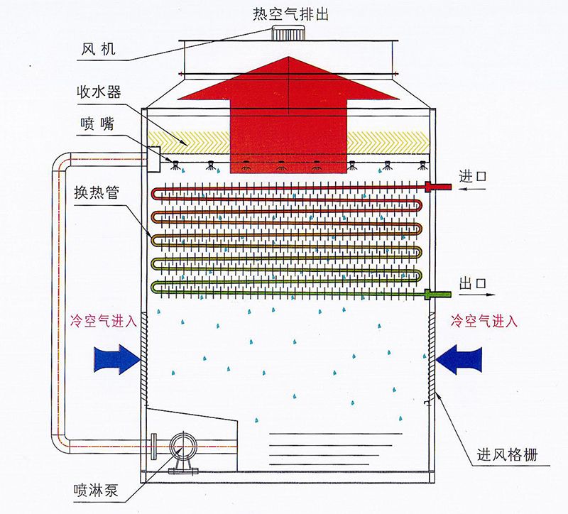 閉式冷卻塔內部結構圖和工作原理閉式冷卻塔工作原理:密閉式冷卻塔,簡稱閉式冷卻塔,(也叫蒸發式空冷器,封閉式冷卻塔)將管式換熱器置于塔內,通過流通的空氣、噴淋水與循環水的熱交換保證降溫效果。由于是閉式循